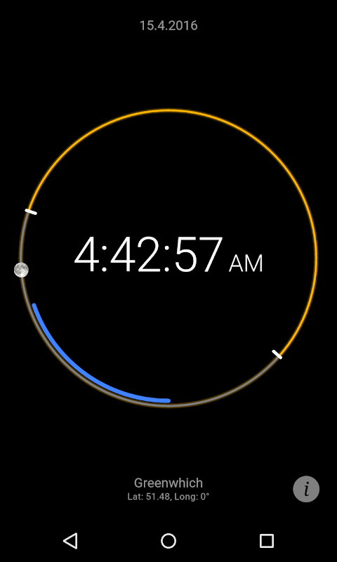 このクロックは、現在の場所のための時間と太陽の位置を示しています。青い線は一日の多くの時間が既になくなっている方法を示しています。