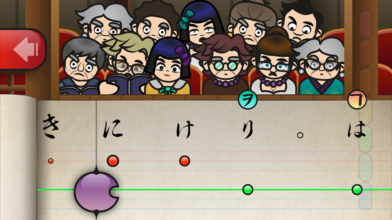 能の節(ふし)の記号を色の点で表し、ゲームでその点を集めながら節を覚えます。上手になると途中から節の色の点が消えても、節の記号によって声の高さを変えて歌えるようになります。上手に歌うと観客がどんどんやって来ます。どんなお客さんが来るかはお楽しみです。