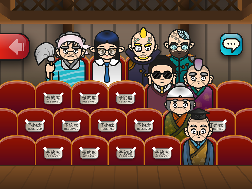 難度の高いレベルをクリアすると、珍しい観客が訪れ来賓席に追加されます。各曲のレベル2の賓客は能に縁のある歴史上の人物、レベル3の賓客は能の主人公です。どんな面々が集まるのか?全ての賓客を集めましょう。