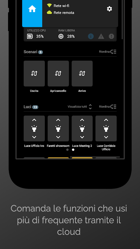 Domotica Labsのクラウドプラットフォームとの統合のおかげで、SUPERVISORは、インターネットルーターに介入することなくさまざまなシステムにアクセスできます。さらに、システム自体に接続しなくても、アプリのメイン画面から最も頻繁に使用される機能を直接制御することができます。