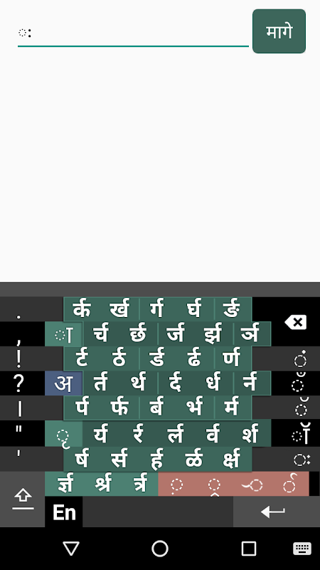 Swarachakraマラー(स्वरचक्रはमराठी)マラーティー語でテキストを入力するためのタッチスクリーンキーボードです。 (ヒンディー語についてSwarachakraヒンディー語を使用してくださいとコンカニためSwarachakraコンカニを使用してください。Swarachakraはグジャラート語、テルグ語、カンナダ語、マラヤーラム語、Odia、パンジャブ語、ベンガル語、タミル語でもご覧になれます)。 Swarachakraはデーヴァナーガリーの構造に基づいて、論理的に順序付けられたデザインを使用しています。 Swarachakraはデーヴァナーガリーの論理構造に応じて、配列決定子音を表示し、音声学的にグループ化され、ほとんどの教科書に見られるものと類似の格子状に配置。