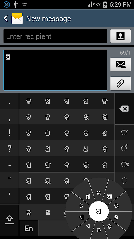 Odiaで(ଓଡିଆ)、私たちは頻繁に子音の組み合わせを入力する必要が(କ)や MATRA (ମାତ୍ରା)( ା)のようなକ + ା =କା 。あなたは子音をタッチすると、子音の組み合わせと10頻繁matras(ମାତ୍ରା)とのチャクラがポップアップ表示されます(କା、କି、କୀ、କୁ、କୂ、କେ、କୈ、କୋ... )。チャクラは、可能な文字の組み合わせのプレビューを提供します。組み合わせを選択するには、それに向かってスタイラスまたは指をスライドさせます。