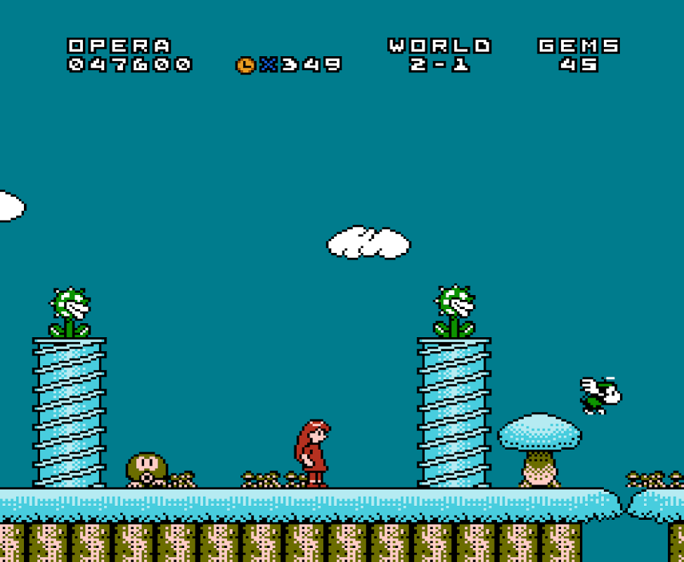 The game world features gems scattered around for Opera to collect and special bricks marked with a “S”, which when hit from below by Opera may reveal more gems or a special item. Other "secret", often invisible, bricks may contain more gems or rare items. If the player gains a heart, Opera will turn purple color. If Opera gets hit in purple color, then instead of dying she turns back to red Opera.