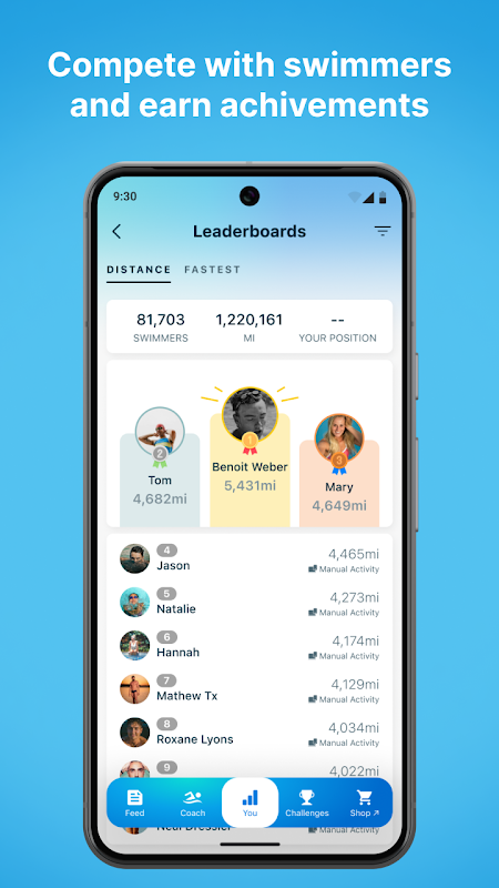 クラブの友達と競い合ったり、グローバル リーダーボードで同じスイマーと競い合ったりして、モチベーションを高めましょう。地元のクラブの他のスイマーと比べて、レーンのリーダーになるために競い合いましょう。