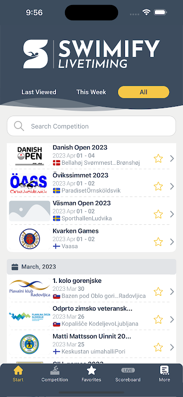 水泳大会のライブタイミング、スタートリスト、結果リストを見る