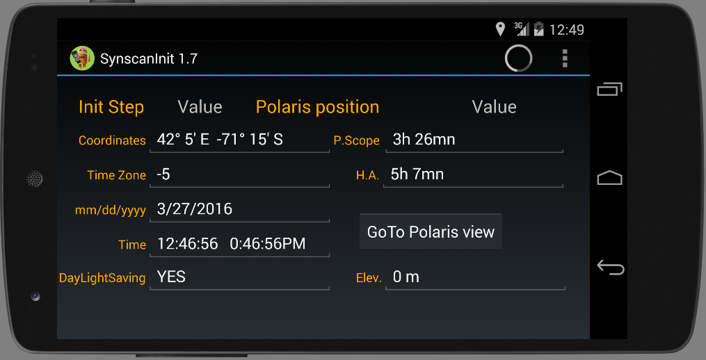 Cette application simple vous permettra d'initialiser rapidement votre synscan pour la mise en station de votre télescope. Il calcule aussi l'angle polaire avec deux reticules differents.