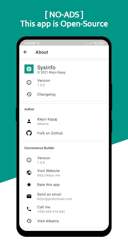 System: Android version, Android version name, Boot loader, Api level, Build ID, Build Time, Java VM details, OpenGL info, Kernel Information, Root access info, System up-time etc.
