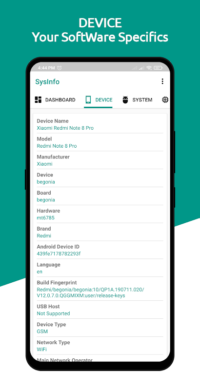 This Device Info application provides almost all the information of your device based on hardware and software specifications. SysInfo app lets you know all the essential details like CPU, GPU, Battery, Screen, Memory, Sensors and all the System info and so on.