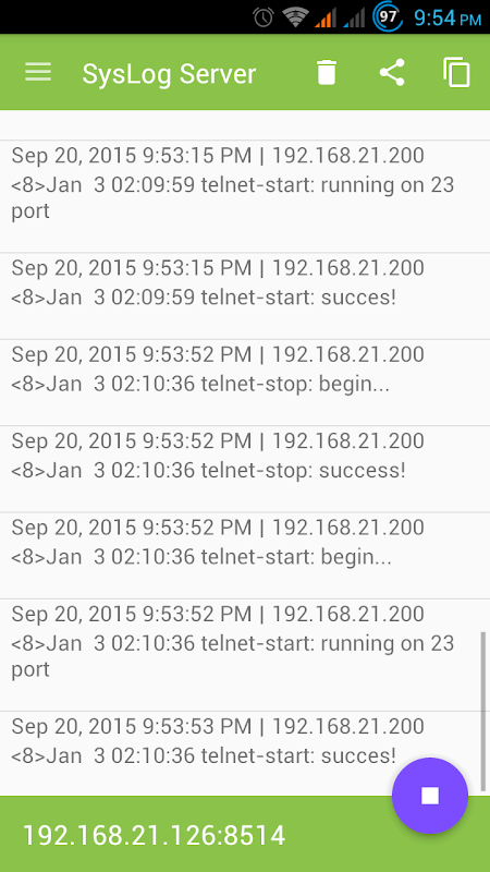 Note, that this server does not require ROOT permissions and can use ports greater than 1023. You can use 514 on a rooted device only.