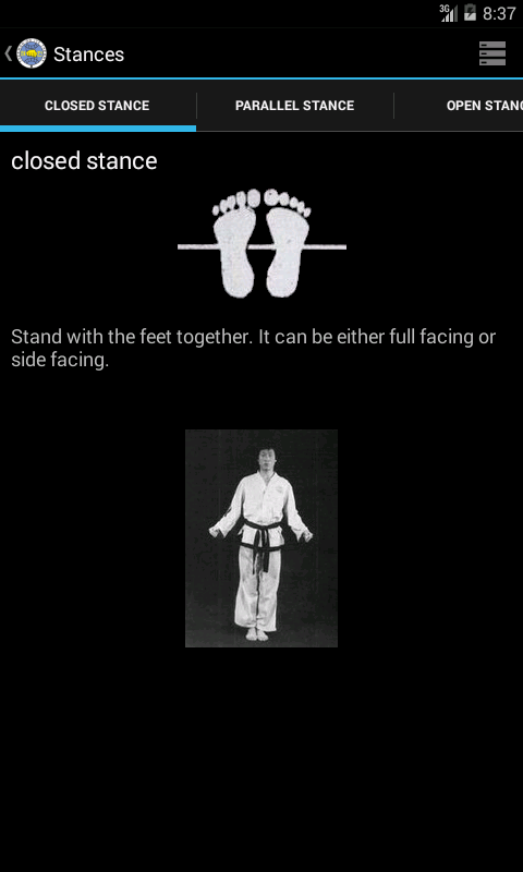 このテコンドーのアプリは、この武道の理論の選択された章で構成されています。