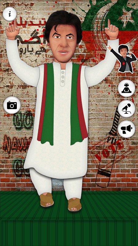 • Real time appearance of Imran Khan as seen in his addresses is given in the form of a realistic cartoon, which responds to different options