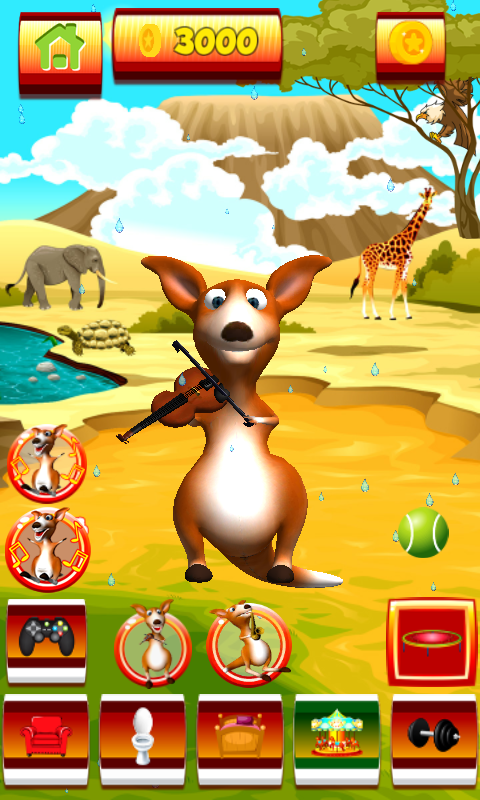 Enjoy the latest kangaroo game free of charge, and be the best guide to your top virtual hero. Come into his beautifully decorated living room, there are many interesting items. Look behind the couch and you will see cute little giraffe. Tap the books to see a smiley face, he turns and jumps around. Check out a window, colorful toucan is here, touch him and he will sing to you. Our pet has musical talents, he knows to play violin and saxophone. You will enjoy in the sounds he performs, listen carefully and you will be amazed. Let’s learn the letters together, just watch the tv screen and repeat. He has a beautiful home gym, because he believes physical exercise matters. He gets his daily workout, because it is very important for kangaroo to stay in shape. He is a proud owner of a treadmill where he can run or walk. Outside there is an awesome playground where this pet loves to spend time. He is very good at sports, and the trampoline is perfect gor his jumping skills, so make sure you make him happy! On the tree you will see a eagle, if you tap him, he will fly away. The popular talking kangaroo is funny, he can dance and he has a beautifully decorated bedroom reserved for his nap time. The red bell is wake him up. His awesome bathroom is reserved for relaxation. That is where this top talking animal can take a bath and brush his teeth. The two of you will play the most amazing mini games and collect coins, in order to unlock the rest of the rooms. Cross all platforms and try to achieve the maximum height. In another mini game do not drop the hammer from your hands and hit this animals as soon as they come out of the pit. Everything is magical in the savanna, and your buddy leads a very impressive life! What do you think? So play the latest kangaroo game application and you will get your daily dose of fun time!