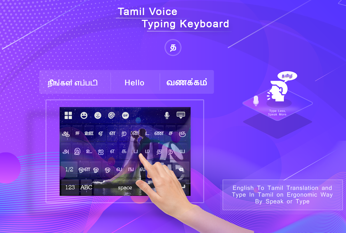Tamil voice typing keyboard is another amazing application for Tamil speaking user who want to type with their voice. Tamil Voice Typing Keyboard - Speech To Text will help you to write your articles faster and this will provide you a good quality speech recognition.