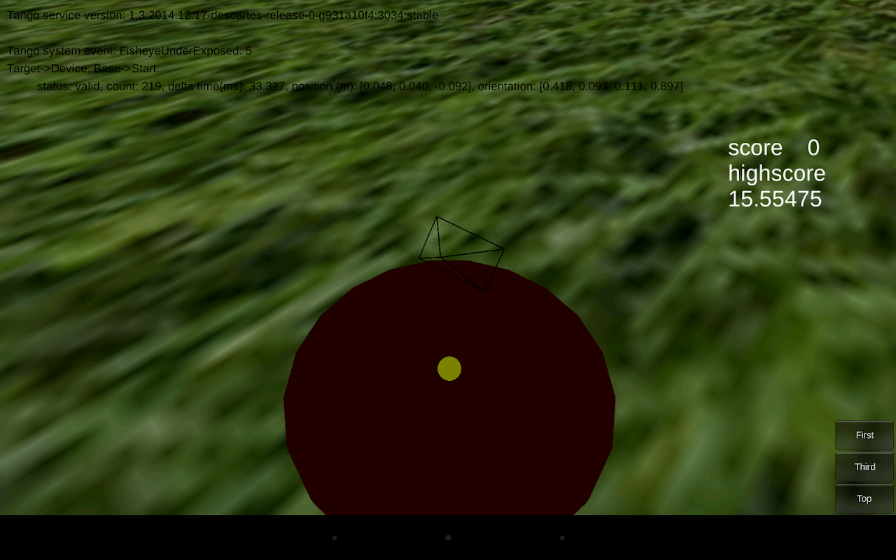 Shot Put for Project Tango. I jammed this game out tonight and there are quite a lot of bugs. I was having a lot of trouble getting the motion tracking to reset properly. It seems that scene reloads crash the program and manually setting the position does not work. I ended up setting the motion tracking whenever the camera touches the boundaries. I need to figure out a more elegant way to do this.