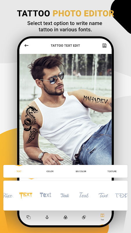 -さまざまなタトゥーフォントで画像にタトゥー名を書き込むには、[テキスト]オプションを選択します。