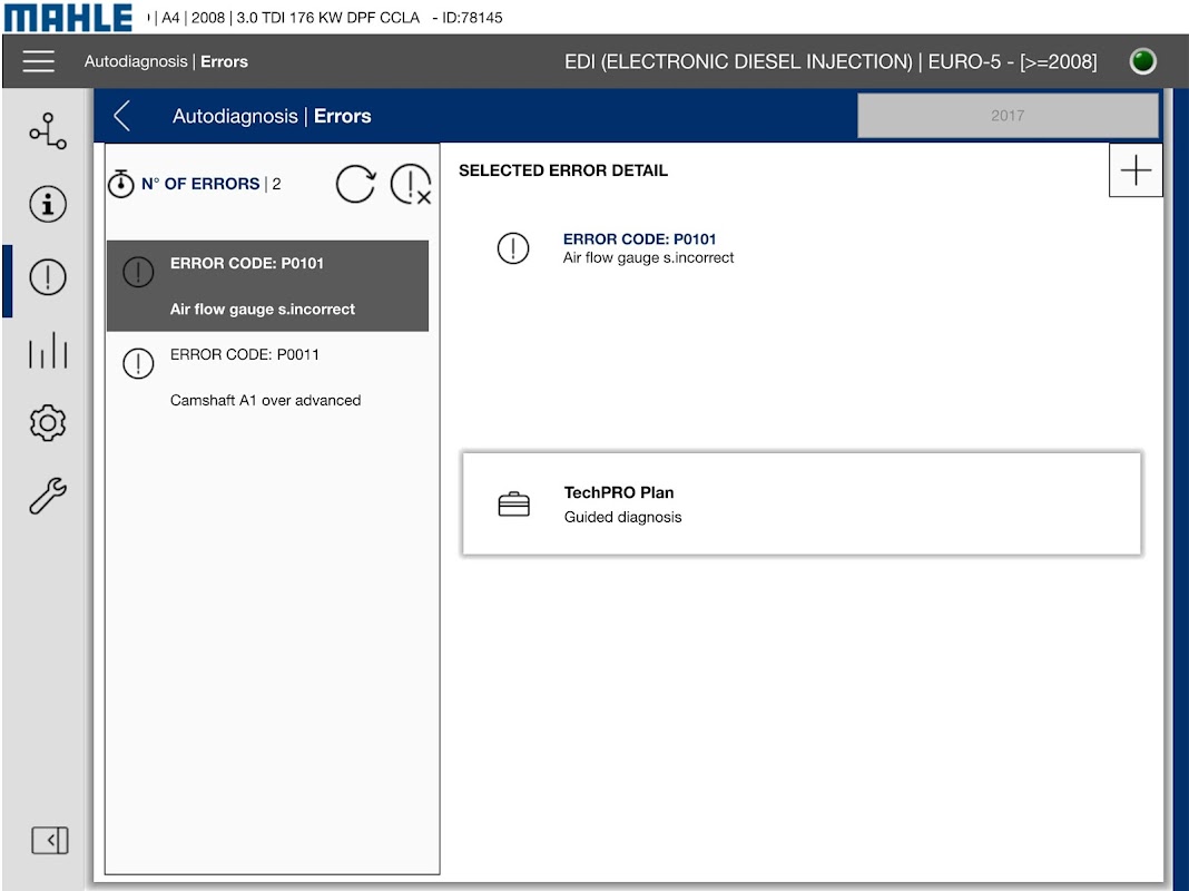 TechPRO®Plan(オプション)は、交換の対象となる部品の識別まで、診断を通して操作者をガイドし、その純正スペアパーツコードを提供します。