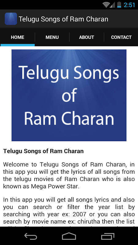 In this app you will get all songs lyrics and also you can search or filter the year list by searching with year ex: 2007 or you can also search by movie name ex: chirutha then the list will be filtered to year the movie was released and then you can go ahead and see the specific movie details and list of songs from that movie and then later see the lyrics of that songs from that specific movie. One can open the lyrics of the song using this app and watch the telugu video song of that movie or listen to telugu audio song of that movie and can learn the lyrics or prepare for any singing competition. I hope this app will help to learn the lyrics of all hit songs of ram charan teja by watching hit video songs and lyrics simultaneously.