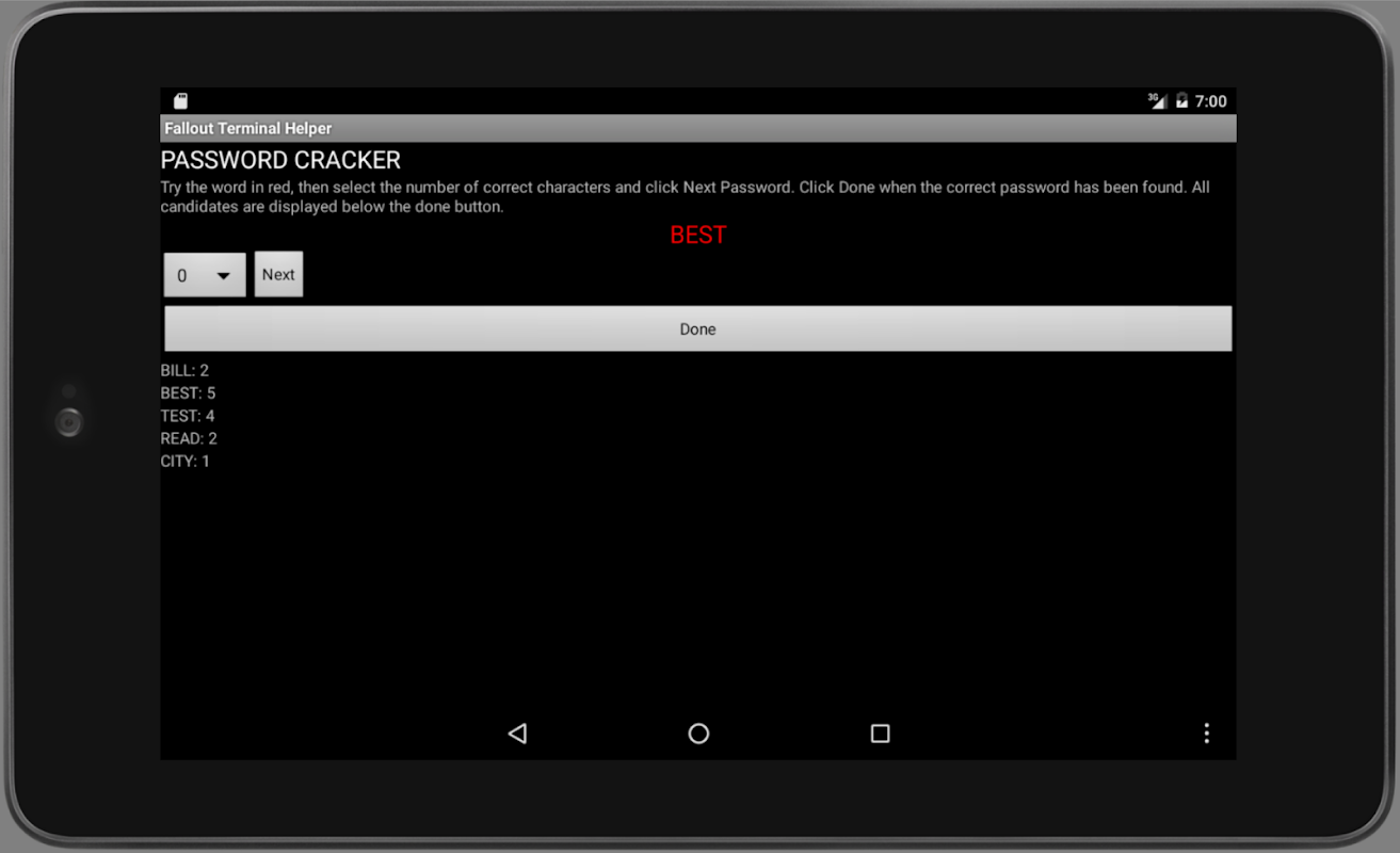 Never be locked out again with the terminal hacking minigame helper. Find the correct password to those pesky terminals without the pen and paper. Simply enter all candidate passwords, then enter the indicated candidate and select the number of correct characters to get the next candidate. Usually works with two guesses for most terminals. Intended to be used to solve in-game minigame - terminal hacking for Fallout 3, Fallout 4, and New Vegas.