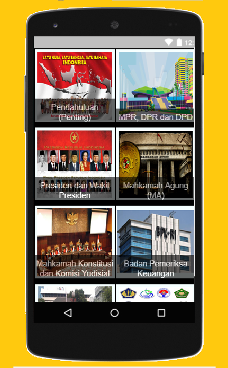 このアプリケーションでは、MPR(人民協議会)、DPR(人民協議会)、DPD(人民代表評議会)、最高裁判所、憲法裁判所、司法委員会、BPKなどの基本的な資料がいくつか説明されています。 (監督機関財務)、調整省庁、省庁、非省庁政府機関(LPNK)、BUMN、大使館/領事館など。