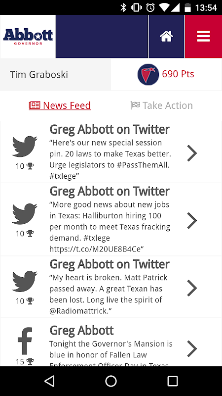 Support Governor Greg Abbott and get live updates, exclusive invites, and special app-only content. Earn points while sharing and signing up new friends with the Texans for Greg Abbott App.