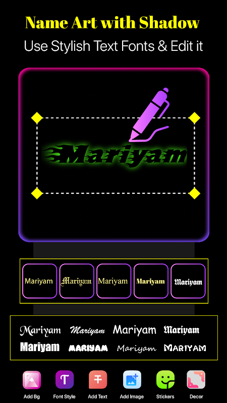 Name Shadow アプリを使用して名前を書き、芸術的なスタイルの署名用の名前を作成します。 Name Art Makerを使用して、写真に3D名前テキストを作成します。このアプリでは、フォント、ステッカー、絵文字を追加しました。