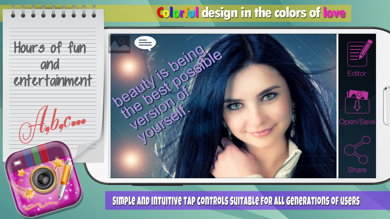 この驚くべきテキスト写真エディタは、子供、ティーンエイジャー、大人のあらゆる世代に適した素晴らしいデザインと直感的なタップコントロールを提供します。男の子も女の子も女の子も大好きです。何を求めている?私たちが特にあなたのために設計したこのすばらしい画像エディタで退屈を取り除きましょう。 写真編集者 コラージュダウンロードして、今までに写真活動への最高の追加のテキストをお楽しみください。 これまで最高のフリーウォーターマークアプリです!