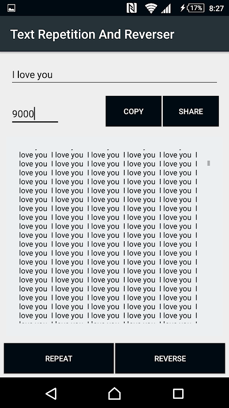 Repeat/Reverse the same text as many times as you want. Enter the number of times you want to repeat the text and click repeat, that's it! you can copy or share to yours friends by just a click. you can also find if a given number is a palindrome or not by clicking "reverse" button. By clicking on "copy" button, the whole text will be copied to your clipboard. By clicking on "share" button, the whole text can be shared to any app.