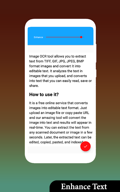 テキストスキャナーは、OCRテキストスキャナーおよび画像からテキストとしても知られています。キーボードでURLや電話番号を入力するのは本当に難しいです。アプリを開いて、希望するテキストまたは画像をスキャンするだけです。高度なフィルター画像をテキストに変換したイメージスキャナーとピクチャースキャナー