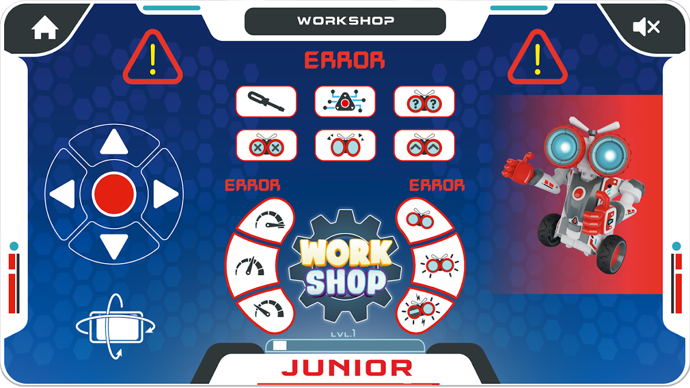 ジュニアを組み立てたらすぐに、内蔵キーパッドで直接動作のプログラミングを開始できます。無料のジュニア アプリ (Android または iOS) をダウンロードして、ジュニアのすべての機能のロックを解除することもできます。すべて正しく組み立てましたか?アプリ内でごっこ遊びのロボット ワークショップ ゲームをプレイして、オンボードの問題を診断します。