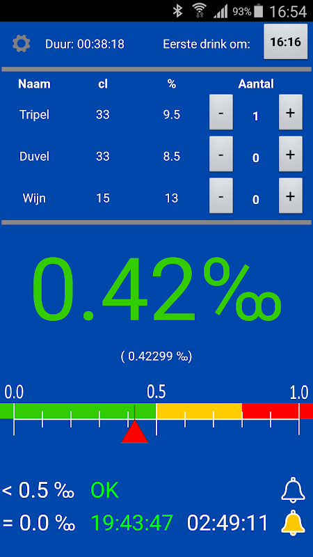 De calculator geeft enkel een indicatie van het alcoholgehalte in je bloed. De werkelijke waarden kunnen enigszins verschillen naargelang je conditie, het feit of je al dan niet gegeten hebt, ... Het gaat in geen enkel geval om een bindend resultaat. De resultaten gaan ook niet voor op de resultaten van een alcoholcontrole uitgevoerd door de politie. Je kan aan de berekening geen rechten ontlenen. Niet ten opzichte van de politie en niet ten opzichte van de ontwerper van deze app.