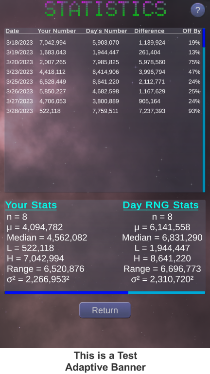 このアプリはあなたの運に基づいて統計を生成します! 0 から 10,000,000 までの数字を振って、毎日の疑似ランダムに生成された値と比較します。このアプリは、ロールの平均、中央値、範囲、標準偏差、分散を時間の経過とともに計算し、RNG と比較します。ラッキーだと思いますか!?