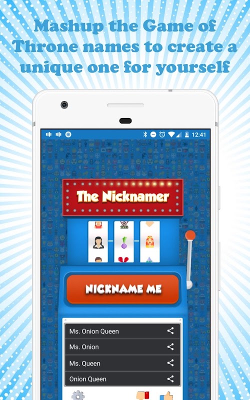 Our unique slot machine design gives you the ability to see icons representing each word before the results are shown. For each nickname generated you will be able to see the variations and combinations of the nicknames given, offering you more options to choose from! The Nicknamer offers you an option to share as well as vote if you like or dislike the nicknames in order to improve the results, so check out our categories to generate funny, crazy and outrages new nicknames.