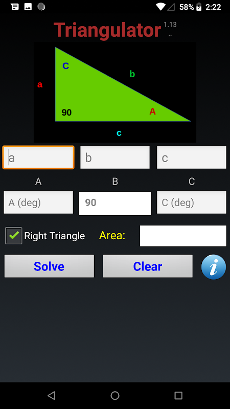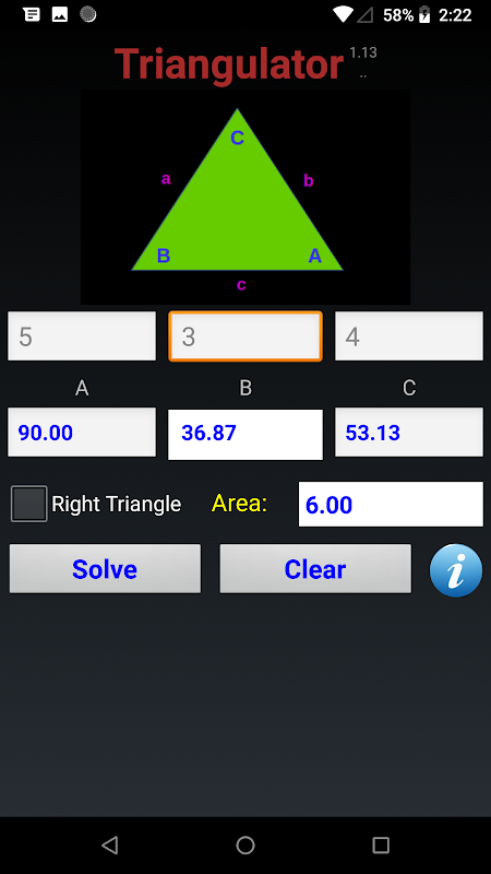 最小限のデータを入力すると、アプリは残りの側面、角度、面積を計算します。