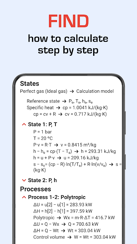 - 状態とプロセスの特性を計算するためのステップバイステップの説明。