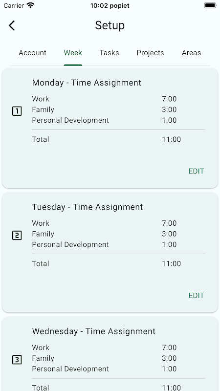 Time Sage の力は、その直感的な組織システムにあります。仕事、家族、個人の成長など、人生のさまざまな領域を定義できます。各エリアに特定の時間数または時間の割合を割り当てると、アプリがバランスの取れたスケジュールを作成します。