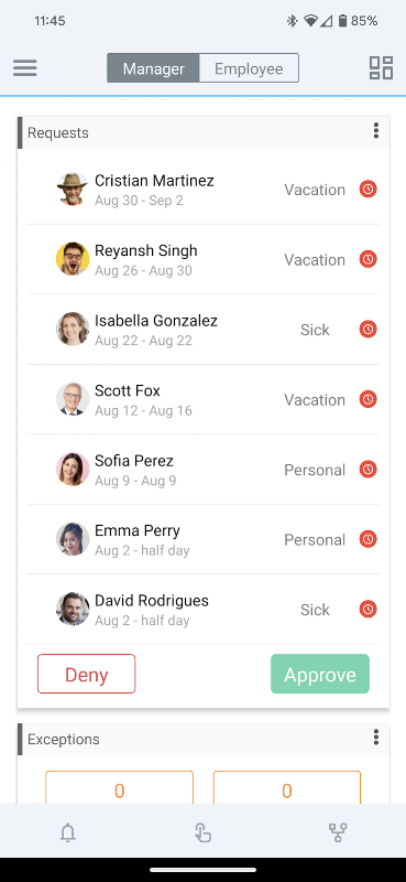 休暇ポリシーとリクエスト: 休暇ポリシーを使用して従業員の休暇、休暇、病気、休日、その他の休暇タイプを管理し、有給休暇のルールを設定し、リクエストの検証を定義します。そして最も重要なことは、従業員がモバイル アプリから直接休暇をリクエストできるようにすることです。 。