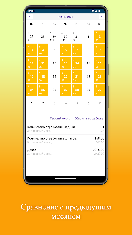 便利なタイムシートカレンダーに労働時間と残業時間を記録すると、アプリケーションが自動的に賃金と収入を計算します。「2時~2時」「1日3日」など、一般的なシフトスケジュールに対応しています。