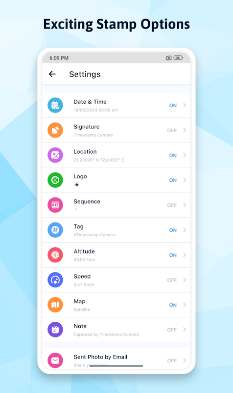 The date time stamp app gives you the option to add current date and time, signature stamp or custom text, your location & logo as stamps to your pictures. You can add sequence to your images as well as tags, altitude and speed as custom stamps onto them.