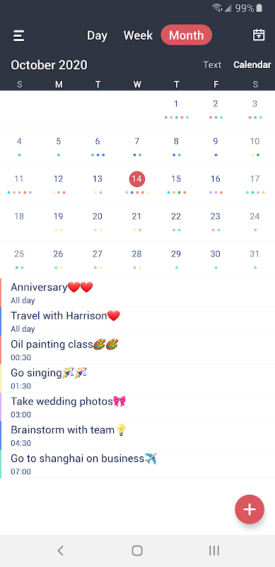 Tiny Calendarは、日、週、月、4日、年、ミニ月、週のアジェンダ、アジェンダの8つの標準ビューをサポートしています。ビューを即座に切り替えて、イベントを見つけたり、探している時間を見つけることができます。