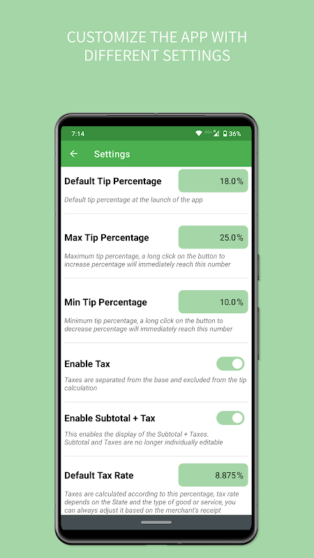• 税金の分離計算: 請求額から税金を簡単に分離して、税引前金額のみに基づいてチップを計算します。