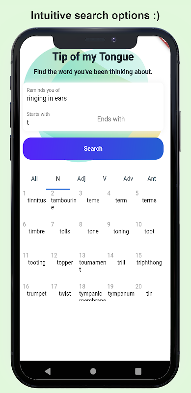私の舌のヒントは、あなたが覚えていない言葉を見つけるのに役立ちます。逆辞書ツールとしても機能します。フレーズやコンセプトを入力するだけで、このアプリはコンセプトに関連する個々の単語を提供します。