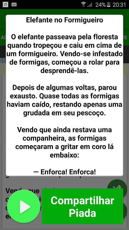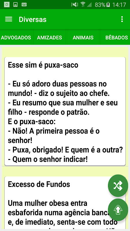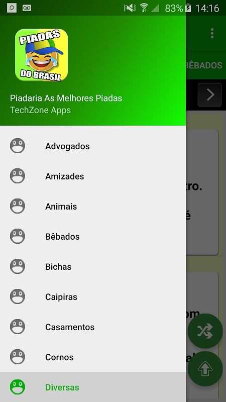 As Melhores piadas do brasil para Android estão no Piadaria, uma repleta seleção de piadas para você ler ou ouvir através do leitor de piadas em áudio, isso mesmo, este app tem um leitor de piadas que transforma o texto em voz, tudo para sua diversão, o app conta com um layout super fácil de encontrar a piada desejada, piadas divididas por categorias, isso mesmo são várias categorias,compartilhe no Whatsapp, Telegram, Facebook, Messenger, e muito mais, é muita piada, neste app você encontra piadas brasileiras curtas, piadas longas, piadas divertidas e muito mais, são as melhores anedotas para você fazer zueira, suas zueiras jamais serão as mesmas.