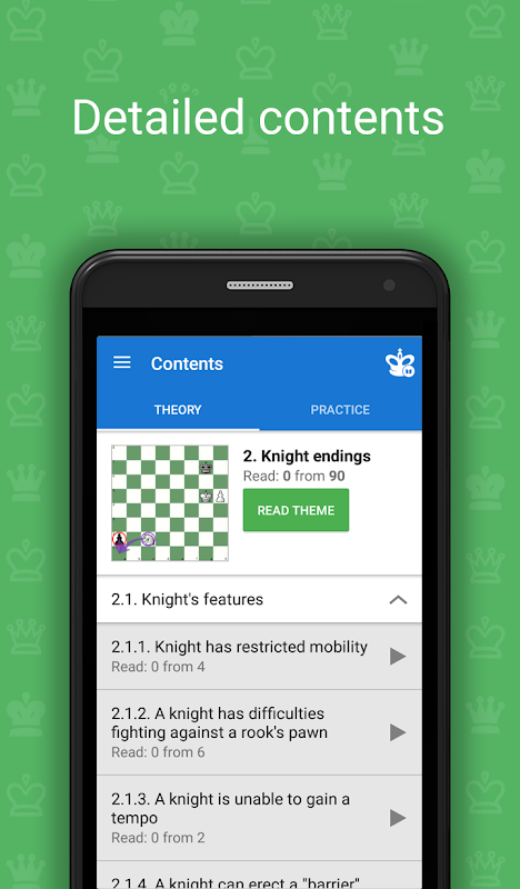 このプログラムは理論的な部分を含んで、実際の例に基づいて、ゲームの一定の段階のゲームの方法を説明します。理論は対話的な方法で提示されるということで、レッスンのテキストを読むだけではなくて、あなたが盤に手段を講じることと盤に不明な動きを解決することなどもできます。