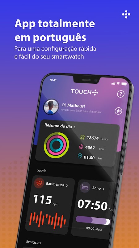 Touch Smart アプリは毎日のパートナーです。ほんの数ステップで Smartwatch Touch を接続し、通話、メッセージ、ソーシャル ネットワークの通知など、ルーチン、トレーニング、健康に関する機能にアクセスできます。 + 8 スポーツ以上;心拍数、歩数、カロリー、距離を制御します。リラクゼーションモード;そして睡眠コントロール。これは操作が簡単なアプリで、完全にポルトガル語で表示されます。ボタンを押すだけで、チュートリアル ビデオを視聴したり、Whatsapp から SAC に直接質問したりできます。