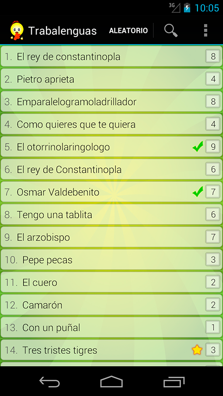 アプリケーションを使用すると、早口言葉のどちらかお気に入りのリストを持ってできるようなスタートメニューには4つのボタン、[すべてを表示し、レベルと最終的には、まだ見ていない早口を参照してください。