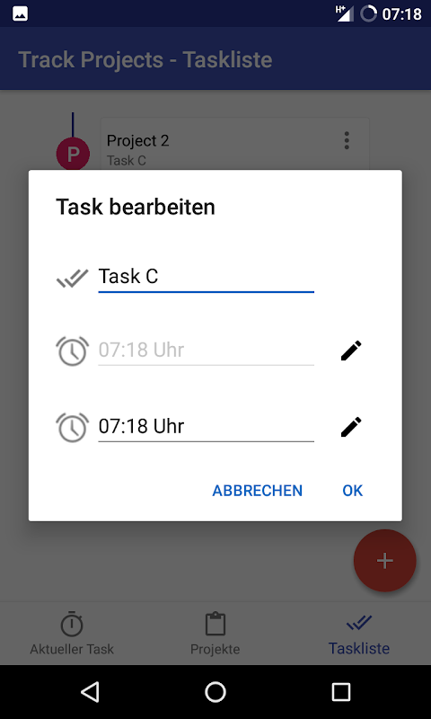 In der App kann man Projekte anlegen und zu jedem Projekt Tasks starten.