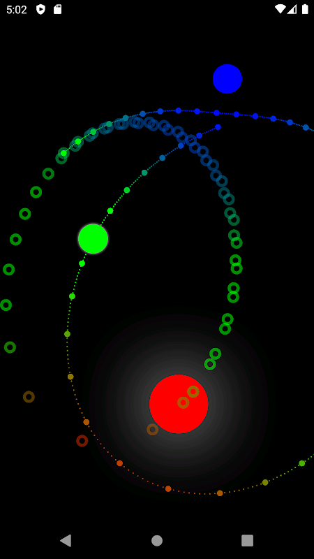 赤と青のボールが重力で緑のボールを引き付けています。緑色のボールは、その動きで軌道を表します。緑のボールの軌道が提案された軌道と一致するまで、赤と青のボールの位置を移動できます。
