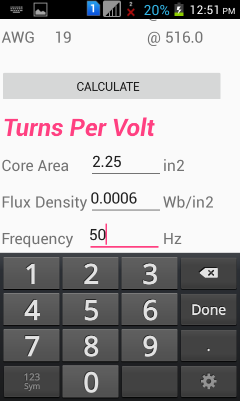 このアプリは、SWG / AWG番号や変圧器のための「ボルト当たりのターン」を算出します。