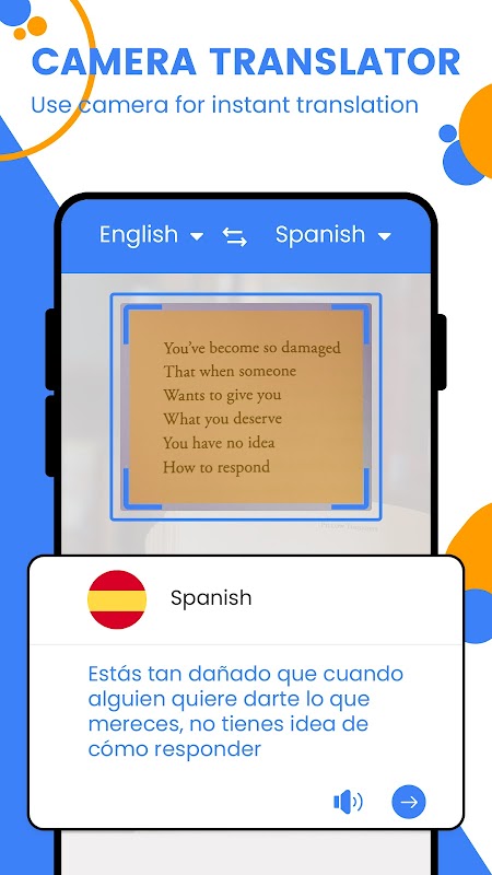話し、翻訳するすべての言語の音声翻訳者は、スペイン語の英語辞書を使用して翻訳し、翻訳を容易にします。チャットメッセージを翻訳するには、チャットトランスレータがメッセージを翻訳し、メッセージを即座に翻訳します。直訳テキストは、画面テキストを読むための言語の壁を取り除きます。