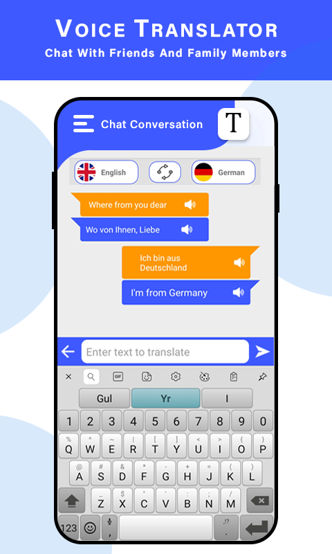 It is free language translator app is used when a user want to chat in multi-language for business cause OR any other cause like want to chat with girl friend in her mother language so Free Translation App with free translator is best language translation app on Google play store. Now a student can easily translate free his or her documents while using translator app free with translator free. New Language translator app is best app for traveler in many countries, so translation app & translator app is suitable for traveler.